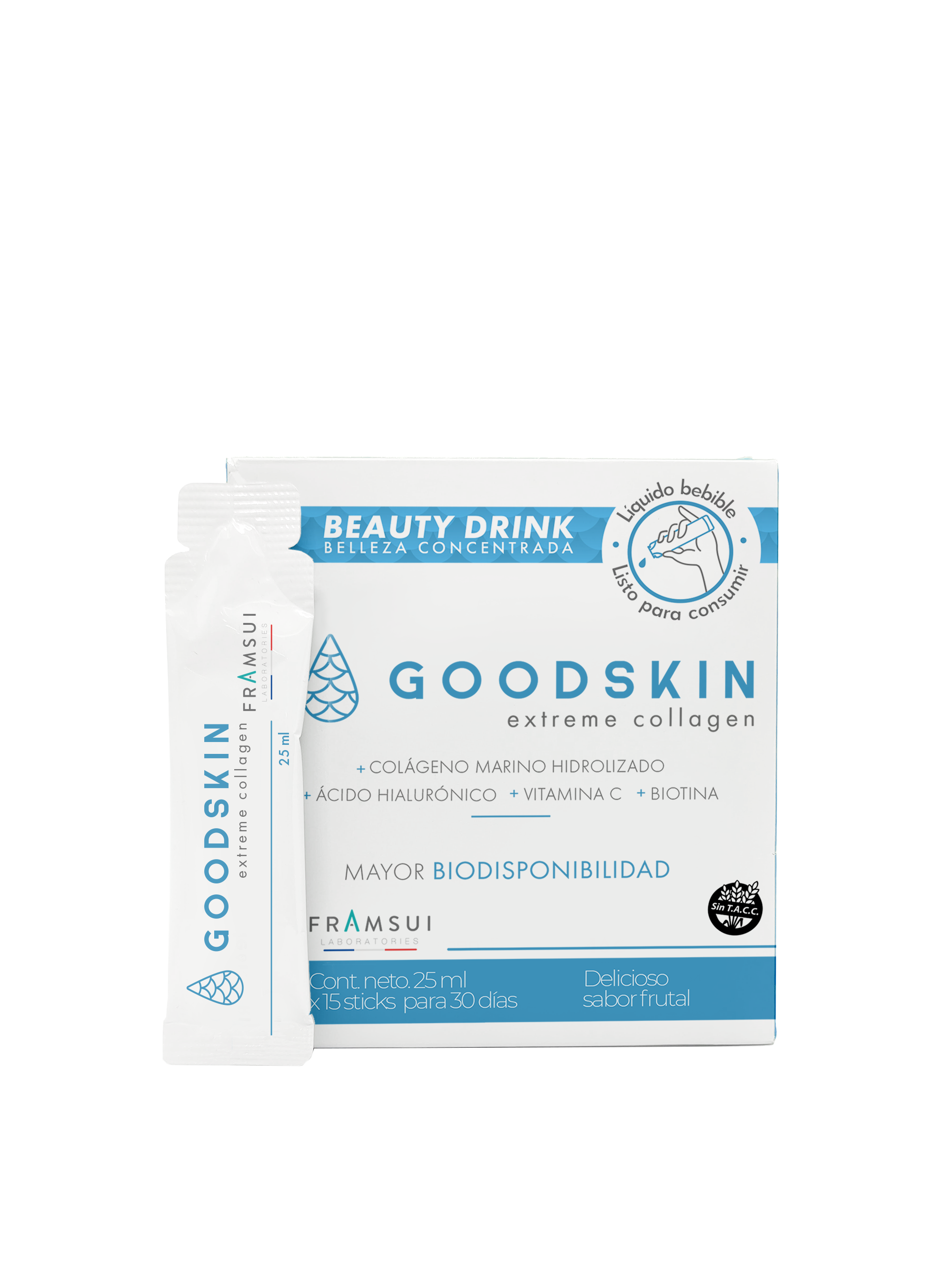 GOODSKIN es una bebida funcional, con delicioso sabor frutal, combinando ingredientes bioactivos, que actúan en forma sinérgica, mejorando su absorción y potenciando sus efectos, con una biodisponibilidad 6 veces mayor que presentaciones de colágeno en polvo o cápsulas.